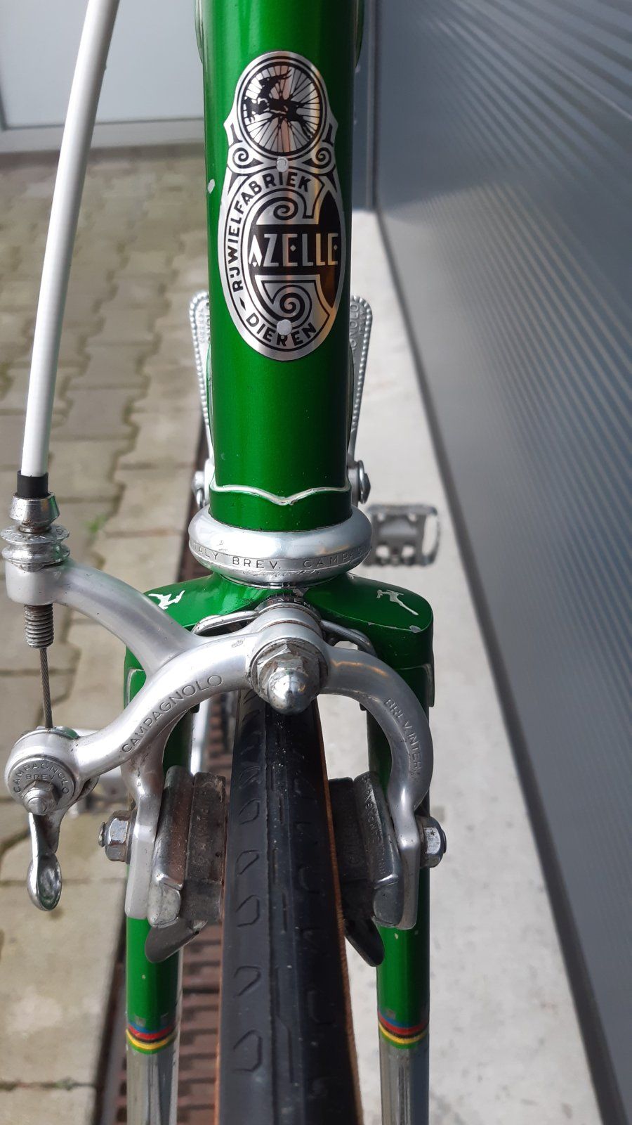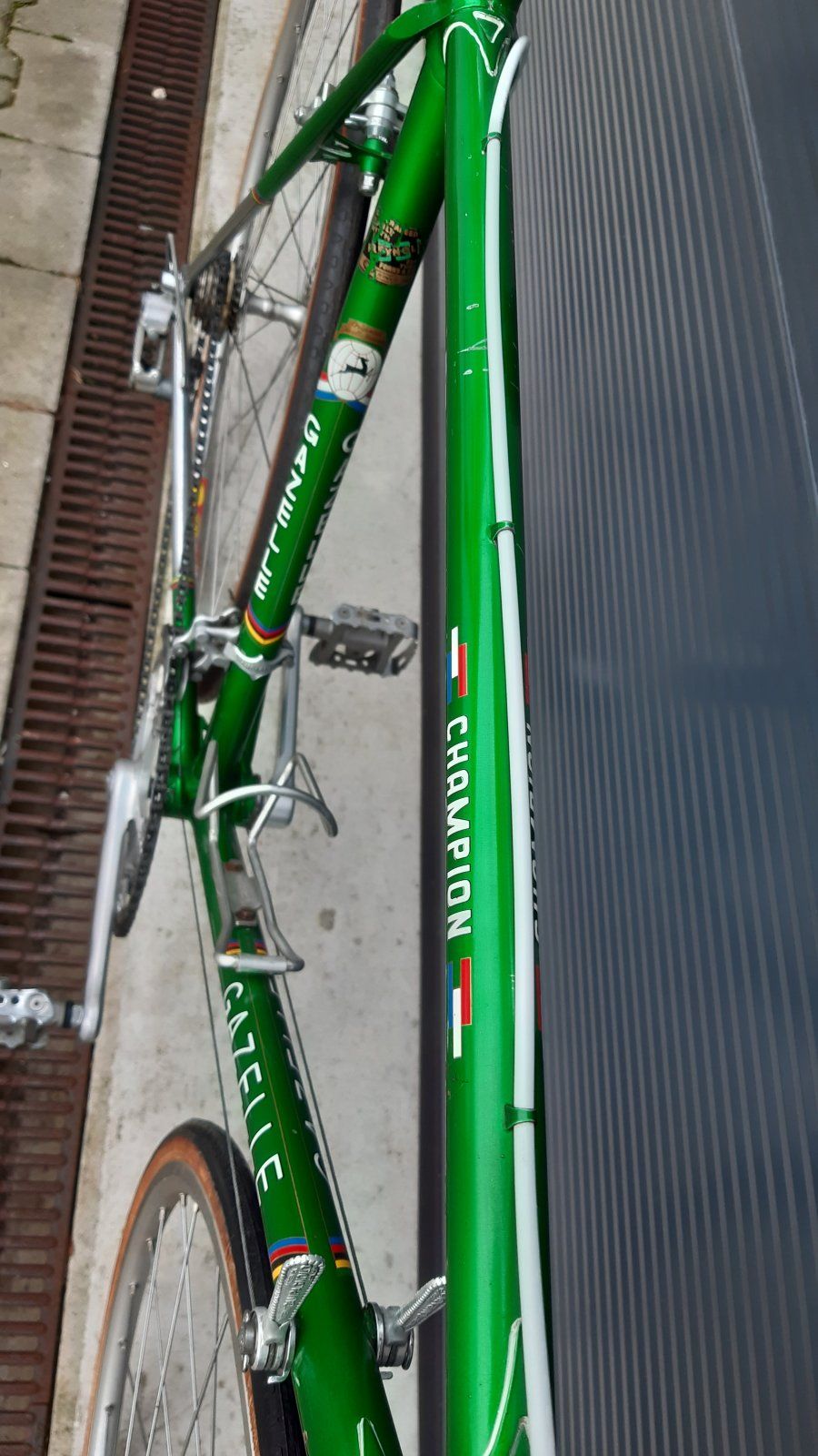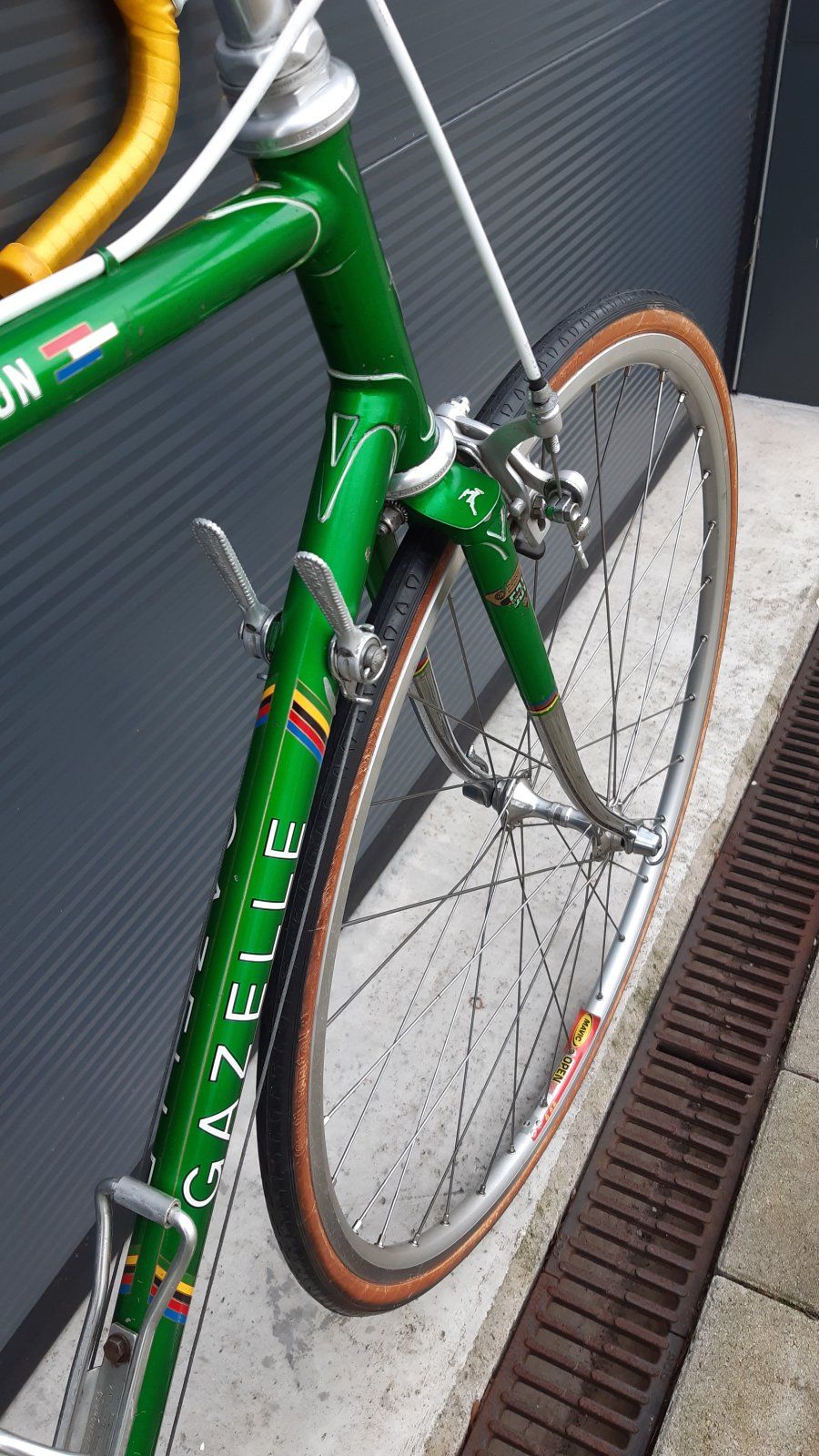 Ich stelle mal meine Brot und Butter Gazelle vor. Der Springbock kam ziemlich abgewirtschaftet, aber komplett um das Jahr 2005 bei mir an, und wenn ich ehrlich zu mir selbst bin, habe ich Ihn nur der Farbe wegen genommen. Nach dem üblichen, Reinigungs, Ausstausch und Einstellprozedere gefiel mir das Rad eigentlich gut, und passte von der Geometrie auch perfekt. Regelmässige Bewegungszeiten haben trotzdem nur meine "Italiener" bekommen. 2007 habe die Mavic Felgen mit den original Naben dann mit 28ern Diamantierten Tufo's beklebt, und das größte Ritzel was die Nuovo Gran Sport Schaltet montiert. (Gravel😁) Damit wollte ich die gerade richtig populär werdende Eroica fahren, dazu ist es bis heute nicht gekommen. Firma, Familie, Haus usw.usw. Trotzdem habe ich immer versucht die meisten meiner Räder, mehr oder weniger zu bewegen, nur der Springbock wurde einfach vergessen😇 Jetzt mal ein paar Bilder und wenn die passenden Pedale montiert sind dreh ich auch mal ne Runde........