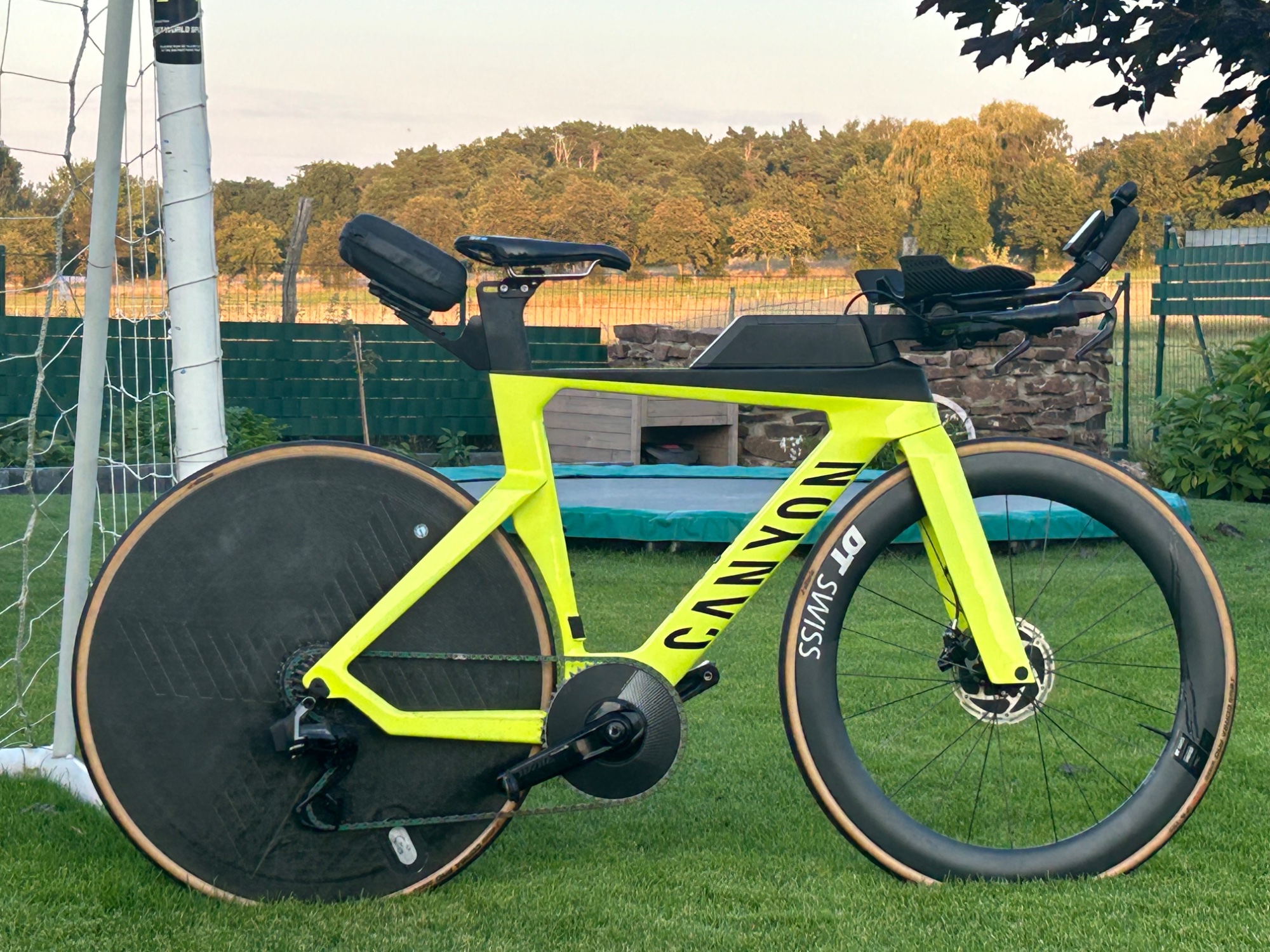 Der größte Vorteil eines Zeitfahrrades besteht nun mal in der speziellen Sitzposition mit den Vorderarmen auf den Aufliegern. Das ist es, was den größten aerodynamischen Vorteil bringt, weit vor Aero-Laufrädern, Aero-Helmen und sonstigen Teilen, die sicher viele Sekunden bringen können, aber in der Regel kein Gamechanger sind. Ein Zeitfahrrad ist im Vergleich zum Rennrad jedoch genau das. Mit dem günstigen Einstiegspreis unter 3.000 Euro bekommt man mit dem Canyon Speedmax CF 7 Disc die Chance in diese Welt einzutauchen und seine Leistungen im Triathlon auch bei längeren Distanzen mit Windschattenverbot nicht zu beschränken.