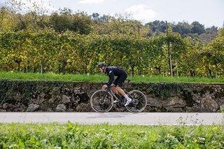 Schon beim ersten Losrollen stellt sich ein gutes Gefühl ein, das sich auf den 80 Kilometern der Testrunde in den Prosecco Hills noch weiter verfestigen sollte. Aufgrund der 50 mm hohen Laufräder beschleunigt das Filante SLR nicht so mühelos und spontan wie ein Rennrad mit extrem leichten Berglaufrädern, aber es wirkt auch keineswegs träge. Die 28 mm breiten Vittoria Corsa Pro Reifen rollen gewohnt leicht und vermitteln mit gut 4 bar Luftdruck jederzeit einen guten Kontakt zur Straße.